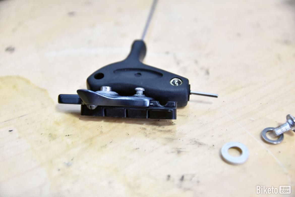 单独把刹车片拿出来,用准备好的2mm号工具把侧面的小螺丝逆时针拧松,注意这个螺丝不需要完全拧出来,拧松1.5-2mm左右就可以了,因为这个螺丝只是起到限位作用,拧松后消除限位,就可以滑出刹车片了。
