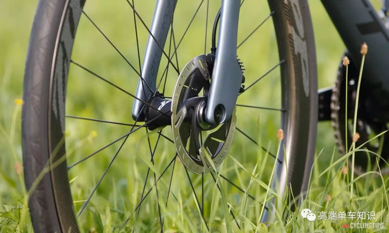 除了制动盘和液压卡钳之外,最明显的区别是箔片制动盘的前叉。由于UCI放宽了3:1空气动力学管形状的限制,Scott的前叉可以完全覆盖平装刹车,从而实现顺畅的气流。 Scott设计的不对称前叉让碟刹车架拥有同样的空气动力学性能。
